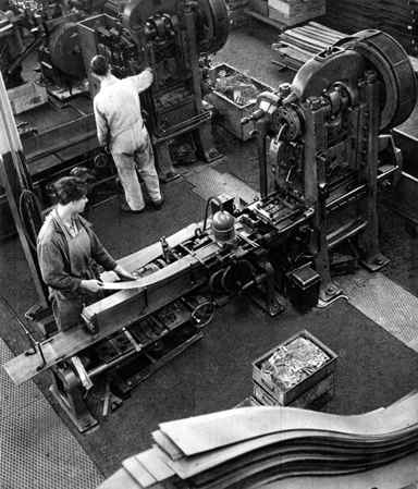 De blikstroken worden met daverend lawaai tot klein plaatjes geponst. |
