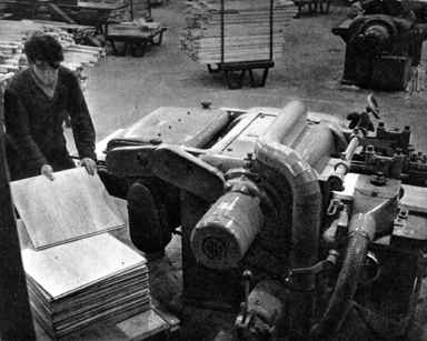 In een ononderbroken stroom glijden de kasten voort op de lopende band, die steeds meer hun voltooiing naderen. |